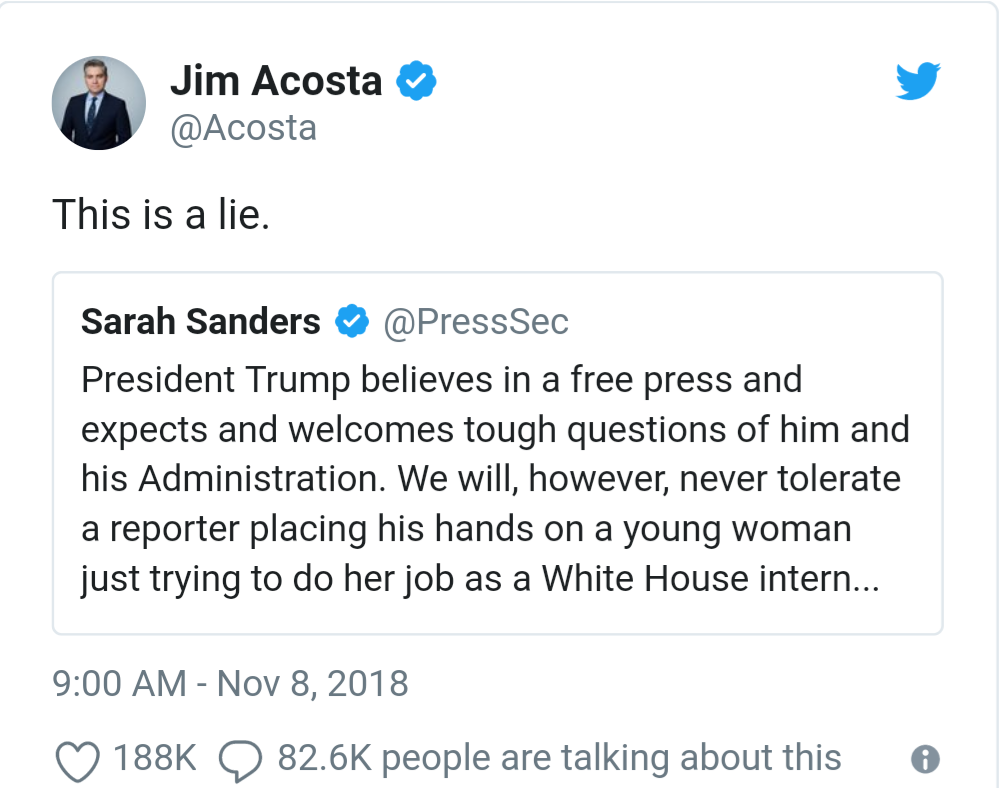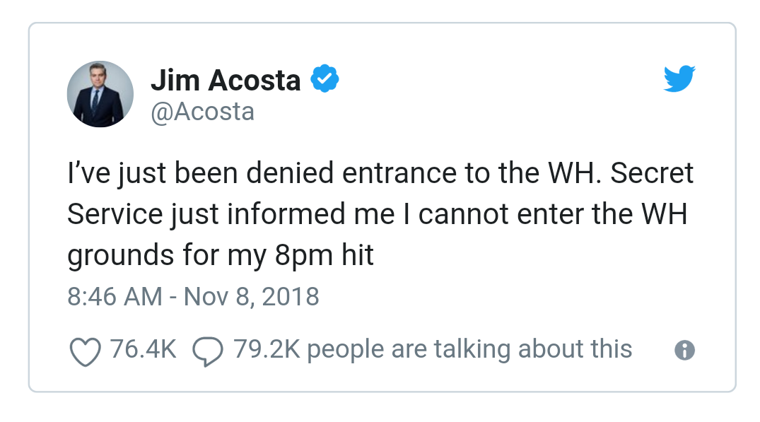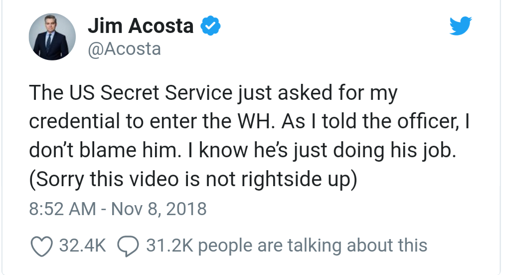 Acosta kemudian mengunggah video ketika ia dilarang masuk ke dalam Gedung Putih. Dalam video yang miring itu, Acosta bercerita di hadapan Secret Service yang mengadangnya.