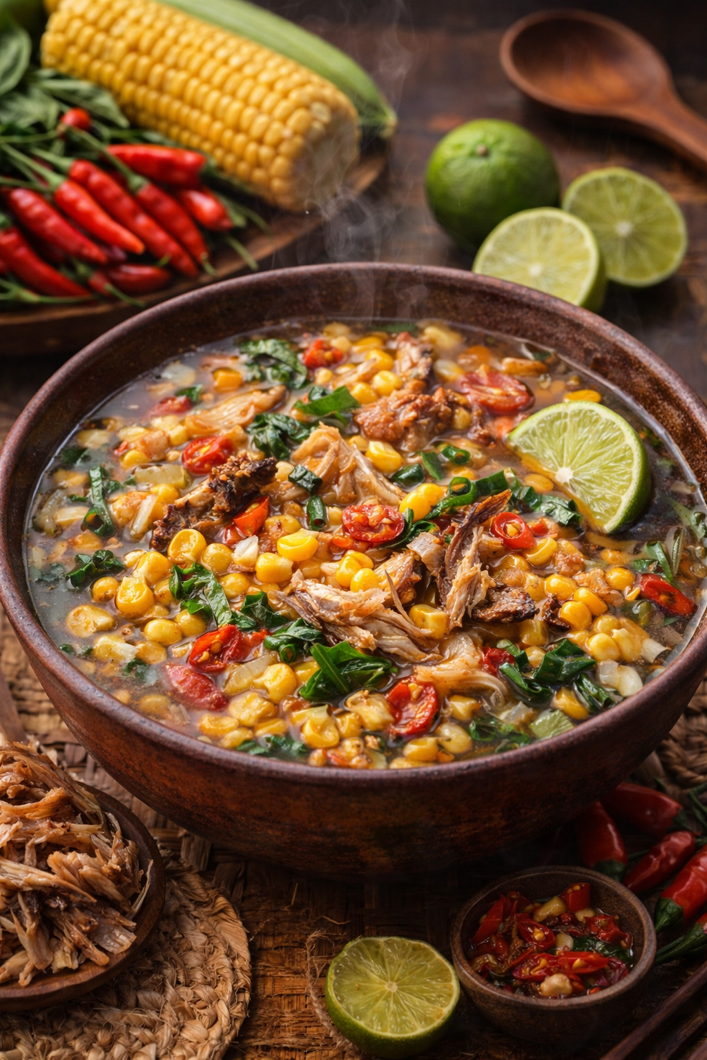 Hidangan ini berbahan dasar jagung pipil muda yang dipadukan dengan suwiran ikan, lalu disiram kuah rempah yang kaya rasa. Sekilas terlihat sederhana, namun cita rasanya mampu menghadirkan sensasi gurih, pedas, segar, hingga sedikit pahit dalam satu suapan.