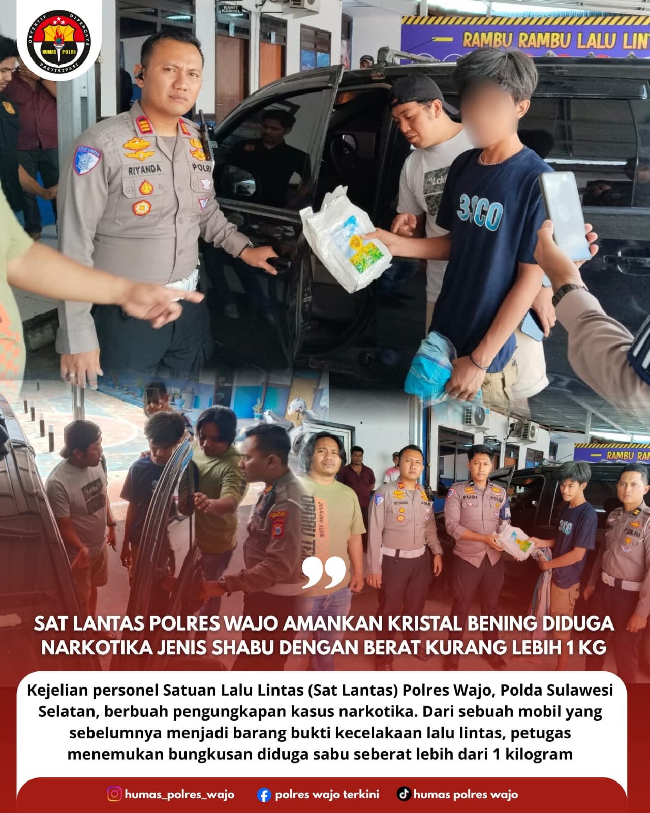 Kumbanews.com – Kejelian personel Satuan Lalu Lintas (Sat Lantas) Polres Wajo, Polda Sulawesi Selatan, berhasil menggagalkan peredaran narkotika jenis sabu seberat lebih dari 1 kilogram. Barang haram itu ditemukan dalam sebuah mobil Wuling Confero yang sebelumnya menjadi barang bukti kecelakaan lalu lintas.