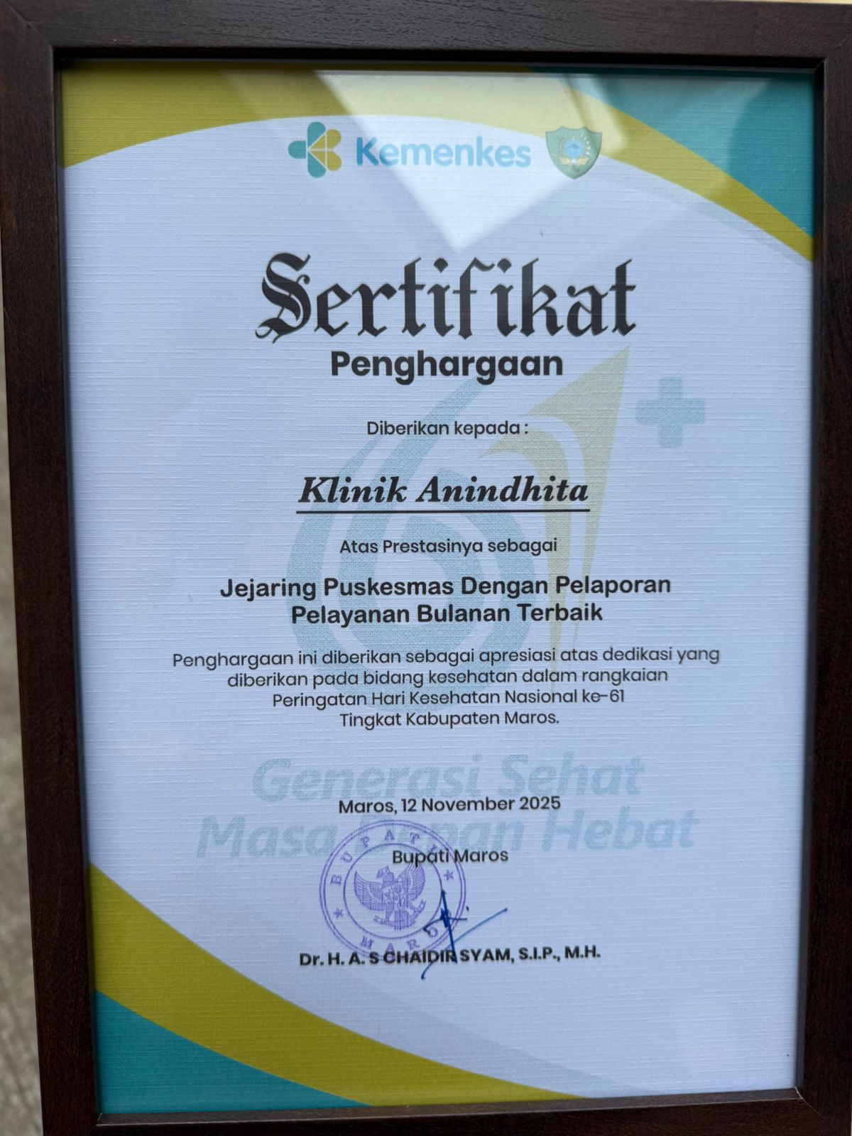 Penghargaan tersebut menjadi bentuk apresiasi resmi Pemerintah Kabupaten Maros terhadap ketelitian dan konsistensi Klinik Anindhita dalam menjaga standar pelaporan kesehatan indikator krusial dalam sistem informasi kesehatan daerah.