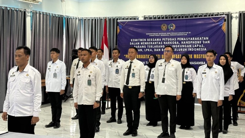 Kumbanews.com – Rumah Tahanan Negara (Rutan) Kelas IIB Masamba ikuti kegiatan Penandatanganan Komitmen Bersama dalam rangka memperkuat komitmen seluruh jajaran Pemasyarakatan terhadap upaya pemberantasan peredaran gelap narkoba, handphone, dan barang terlarang lainnya yang dilaksanakan oleh Direktorat Jenderal Pemasyarakatan, (20/10/2025).