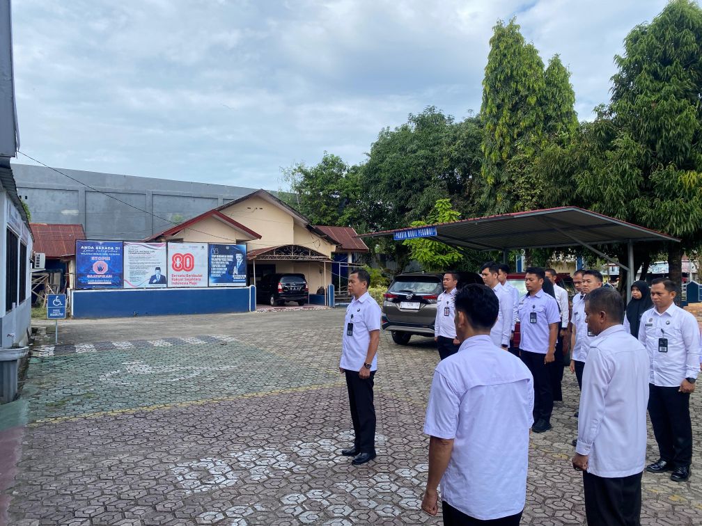 Apel pagi ini dilaksanakan di halaman depan kantor Rutan Barru dengan penuh khidmat. Seluruh pejabat struktural dan jajaran staf turut hadir, menunjukkan kekompakan dan kedisiplinan dalam melaksanakan kewajiban rutin.