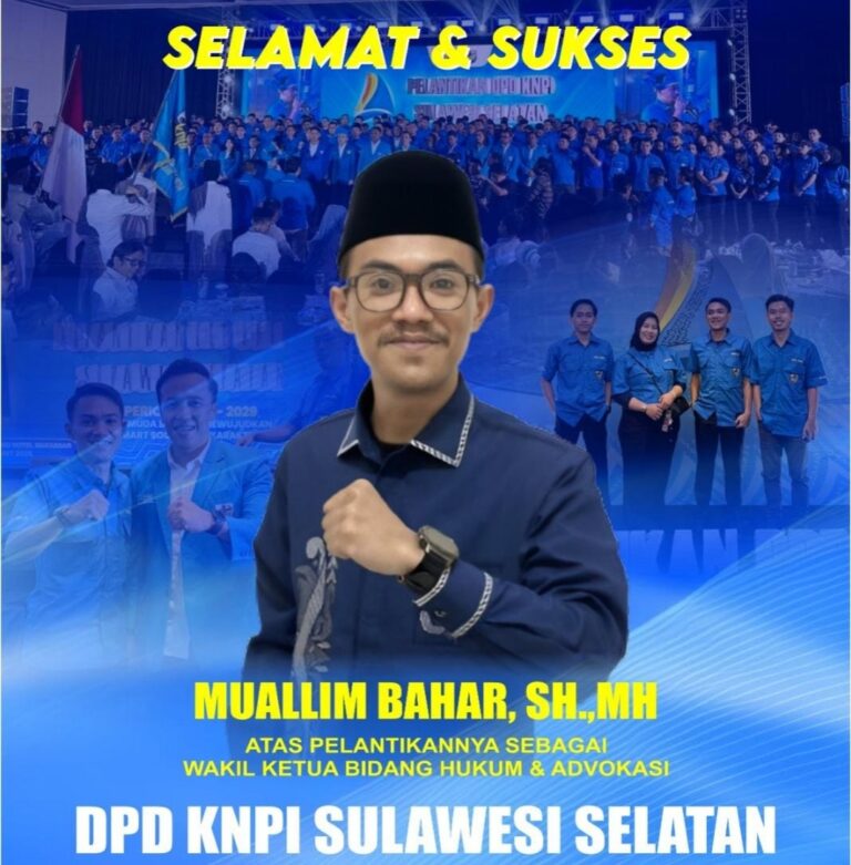 Kumbanews.com – Dewan Pengurus Daerah (DPD) Komite Nasional Pemuda Indonesia (KNPI) Sulawesi Selatan melantik jajaran pengurus baru pada Senin, 9 Maret 2026 di Makassar. Dalam kepengurusan tersebut, Muallim Bahar menjabat sebagai Wakil Ketua Bidang Hukum dan Advokasi.