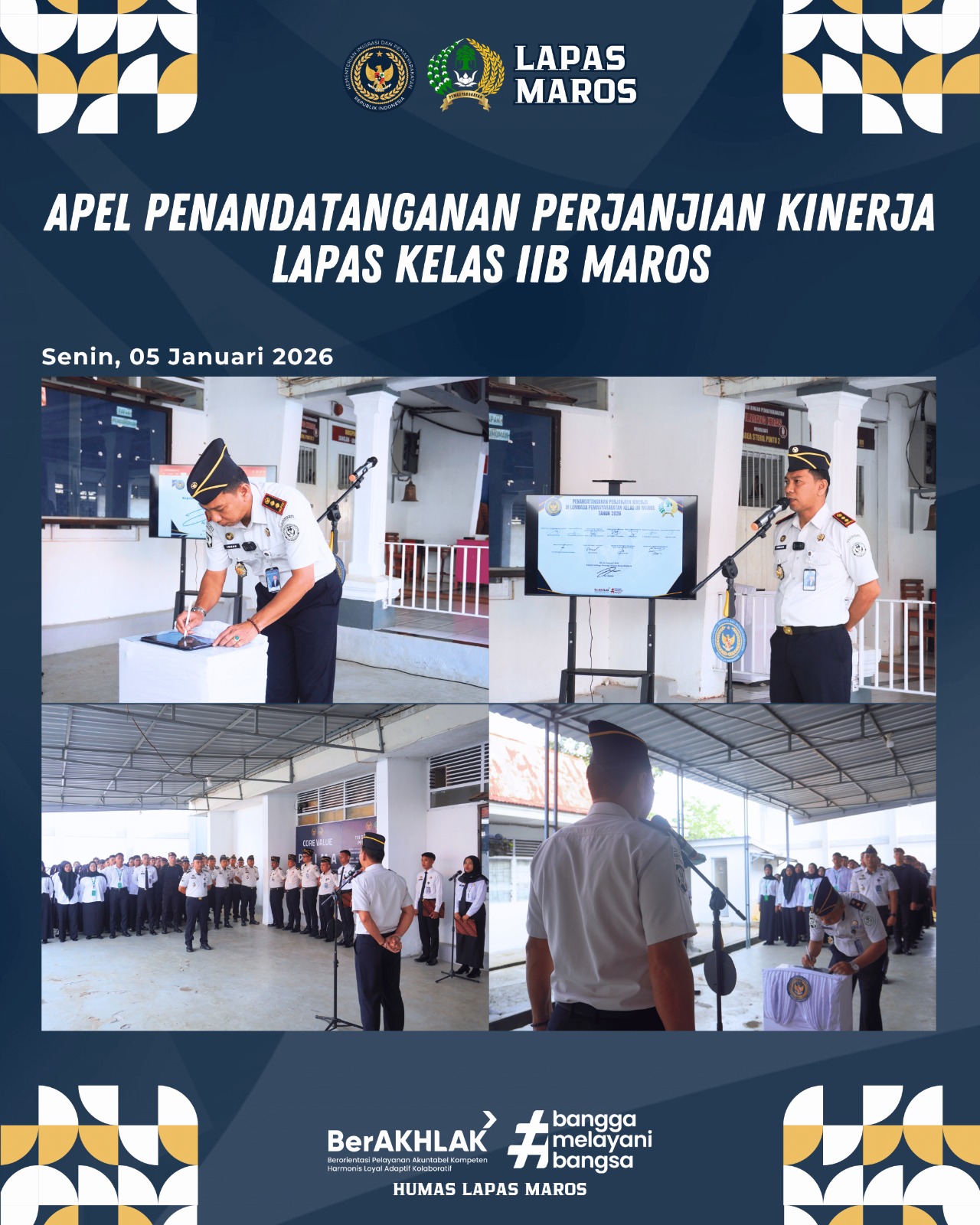 Kumbanews.com – Lembaga Pemasyarakatan (Lapas) Kelas IIB Maros resmi menandatangani Perjanjian Kinerja Tahun 2026 sebagai langkah penegasan standar kerja terukur dan akuntabel, Senin (05/01).