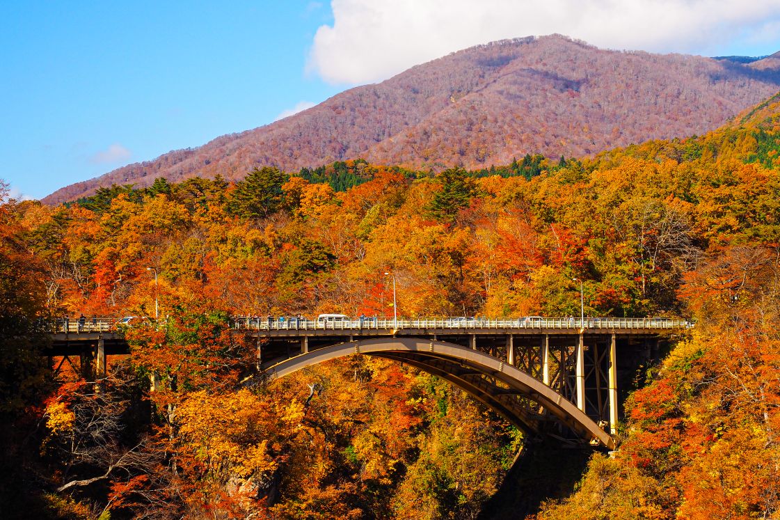 Lembah Naruko menyuguhkan tebing curam yang dipenuhi momiji berwarna cerah. Pemandangan dari Jembatan Ōfukazawa bahkan menjadi ikon musim gugur di Tohoku.