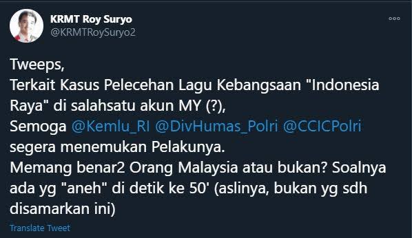 “Tweeps, terkait kasus pelecehan lagu kebangsaan ‘Indonesia Raya’ di salah satu akun MY (?), Semoga @Kemlu_RI, @DivHumas_Polri @CCICPolri segera menemukan pelakunya,” kata Roy Suryo lewat jejaring Twitter miliknya, Senin (28/12/2020) malam.