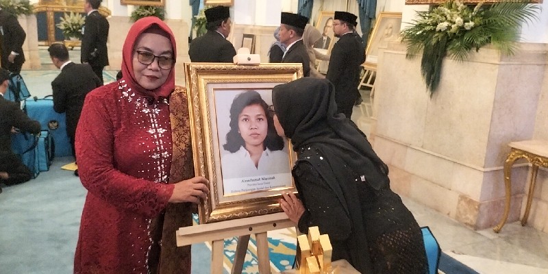Keluarga Marsinah mencium foto Marsinah usai mewakilinya menerima gelar Pahlawan Nasional di Istana Negara, Jakarta, Senin, 10 November 2025 (Foto: RMOL)