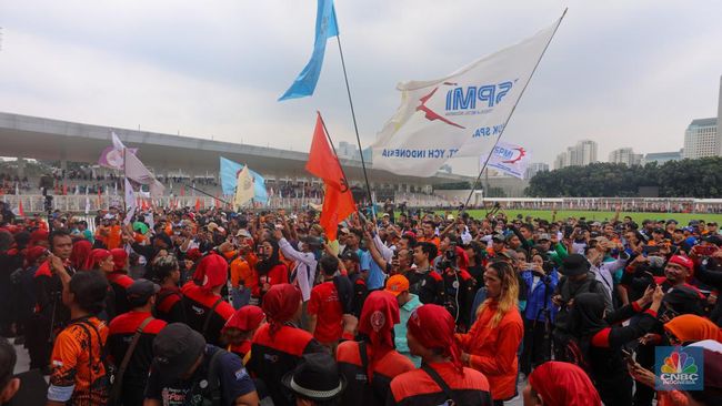 Foto: Buruh menghadiri acrara May Day Fiesta di Stadion Madya, Jakarta, Rabu (1/5/2024). (CNBC Indonesia/Faisal Rahman)