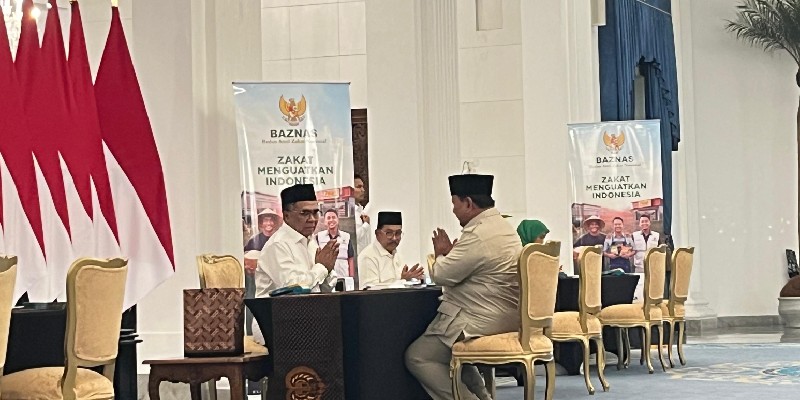 Presiden Prabowo Subianto tiba di lokasi mengenakan baju safari krem dan peci hitam, didampingi Sekretaris Kabinet Teddy Indra Wijaya. Prabowo duduk, menyerahkan zakat melalui akad dengan berjabat tangan bersama petugas, lalu menutup prosesi dengan doa.