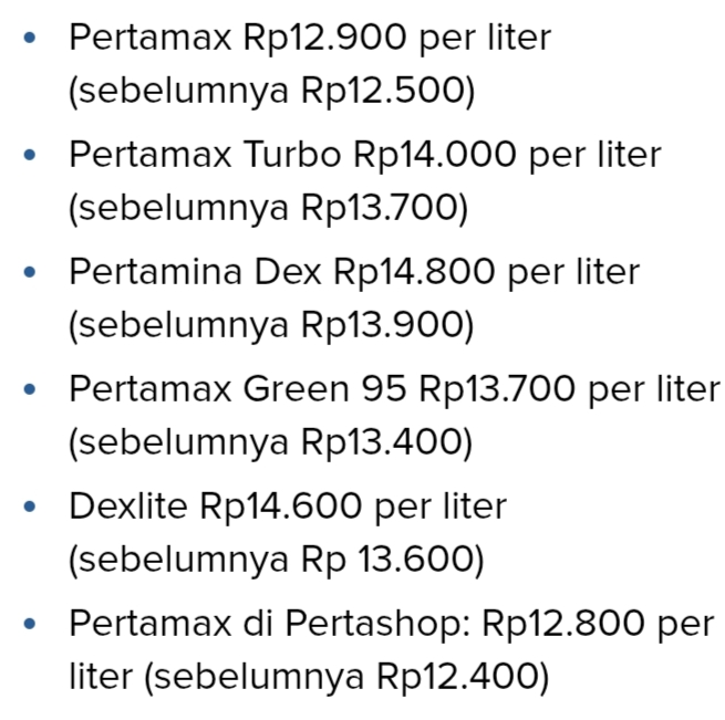 “PT Pertamina (Persero) melakukan penyesuaian harga bahan bakar minyak (BBM) Umum dalam rangka mengimplementasikan Keputusan Menteri (Kepmen) ESDM No. 245.K/MG.01/MEM.M/2022 sebagai perubahan atas Kepmen No. 62 K/12/MEM/2020 tentang Formula Harga Dasar Dalam Perhitungan Harga Jual Eceran Jenis Bahan Bakar Minyak Umum Jenis Bensin dan Minyak Solar yang Disalurkan Melalui Stasiun Pengisian Bahan Bakar Umum,” demikian bunyi keterangan Pertamina soal perubahan harga BBM terbaru, dikutip Jumat (31/1/2025).