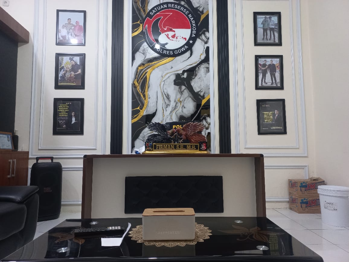 Pantauan media menunjukkan ruang kerja baru itu tampil lebih bersih, rapi, dan sejuk. Tegel putih bercorak memberikan kesan dingin dan nyaman, foto-foto keluarga yang tersusun rapi membuat suasana terasa hidup, sementara papan nama Kasat Narkoba yang berdampingan dengan simbol ayam jantan berwarna hitam dan coklat menambah wibawa khas putra Sulawesi Selatan.
