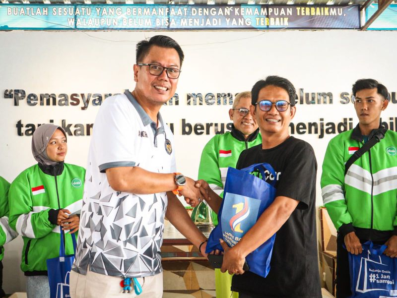 Para pengemudi ojol tampak antusias menerima bantuan dan mengapresiasi perhatian dari pihak rutan.