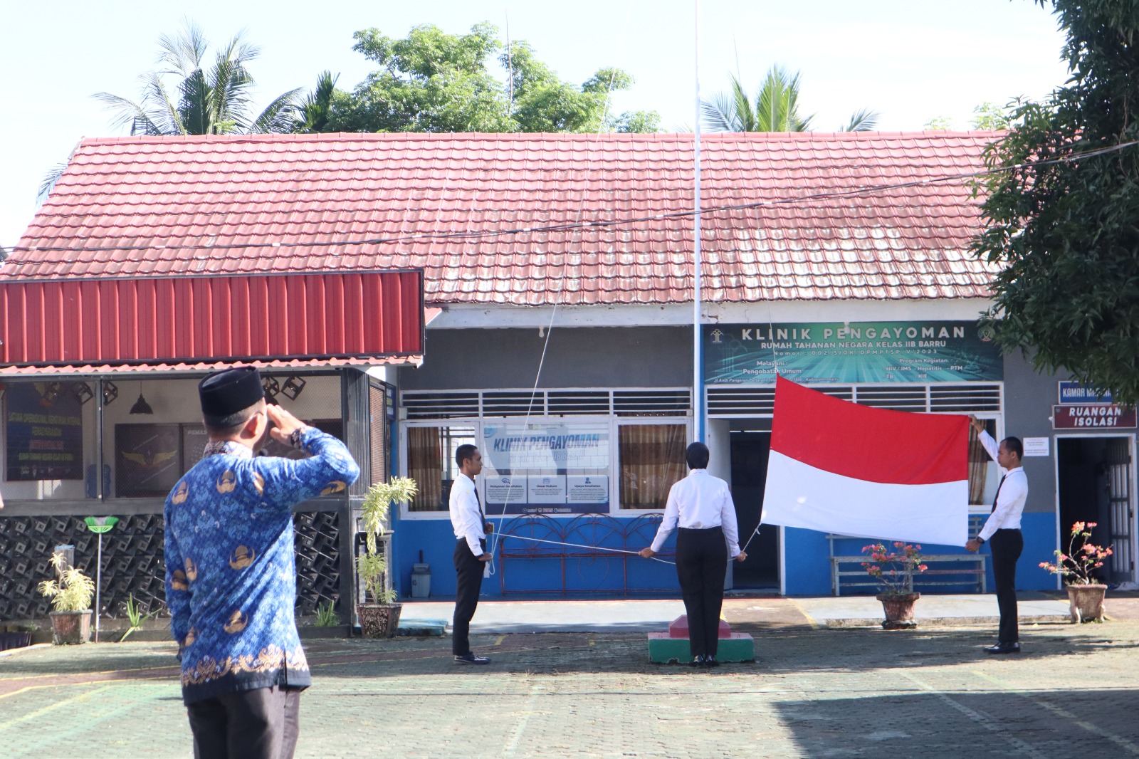 Kepala Rutan Kelas IIB Barru, Amsar, bertindak sebagai Inspektur Upacara. Di bawah sinar mentari pagi, para peserta berdiri tegap, sementara bendera Merah Putih berkibar megah diiringi lantunan Indonesia Raya. Wajah-wajah penuh semangat tampak memancarkan kebanggaan sebagai bagian dari bangsa yang besar.