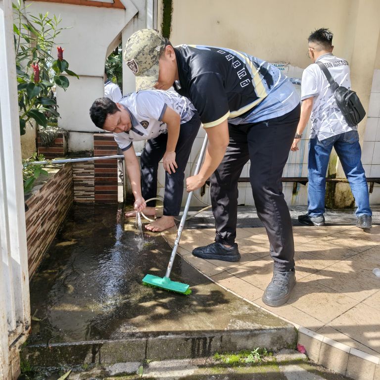 Sejumlah warga binaan turut membersihkan area masjid bersama petugas dan masyarakat. Mereka menyapu halaman, membersihkan ruang ibadah, serta merapikan lingkungan sekitar.