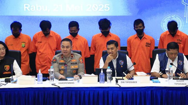 Dirtipidsiber Bareskrim Polri, Brigjen Himawan Bayu Aji (ketiga dari kiri), saat memimpin konferensi pers kasus […]