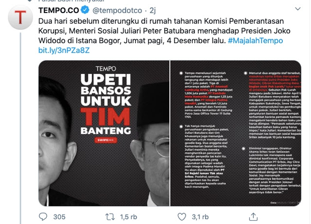 “Dua hari sebelum diterungku di rumah tahanan Komisi Pemberantasan Korupsi, Menteri Sosial Juliari Peter Batubara menghadap Presiden Joko Widodo di Istana Bogor, Jumat pagi, 4 Desember lalu,” tulis Tempo, dikutip dari akun Twitternya, @tempodotco, Senin (21/12).[]