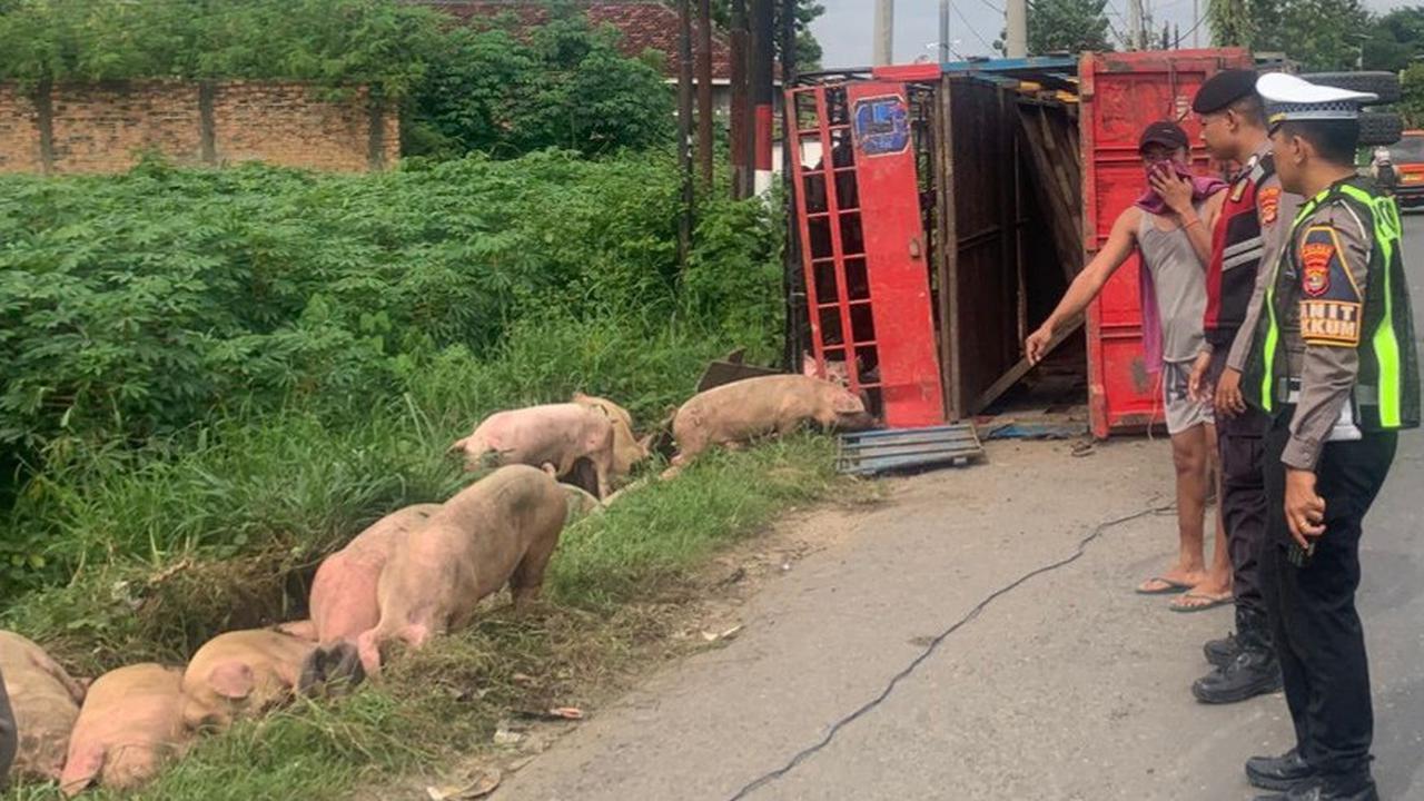 Sebuah truk bermuatan 92 ekor babi ternak mengalami kecelakaan lalu lintas dan terguling di Jalan Lintas Sumatera (Jalinsum), Kecamatan Terbanggi Besar, Kabupaten Lampung Tengah, Rabu siang (14/1/2026). (Dok Ist)