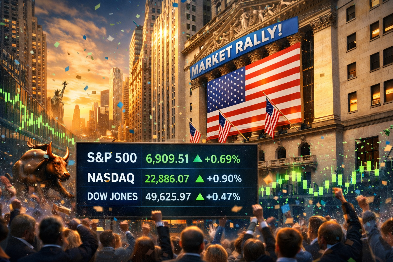 Mengutip Reuters, indeks S&P 500 naik 0,69 persen ke level 6.909,51. Sementara Nasdaq Composite melonjak 0,90 persen menjadi 22.886,07, dan Dow Jones Industrial Average menguat 0,47 persen ke posisi 49.625,97.